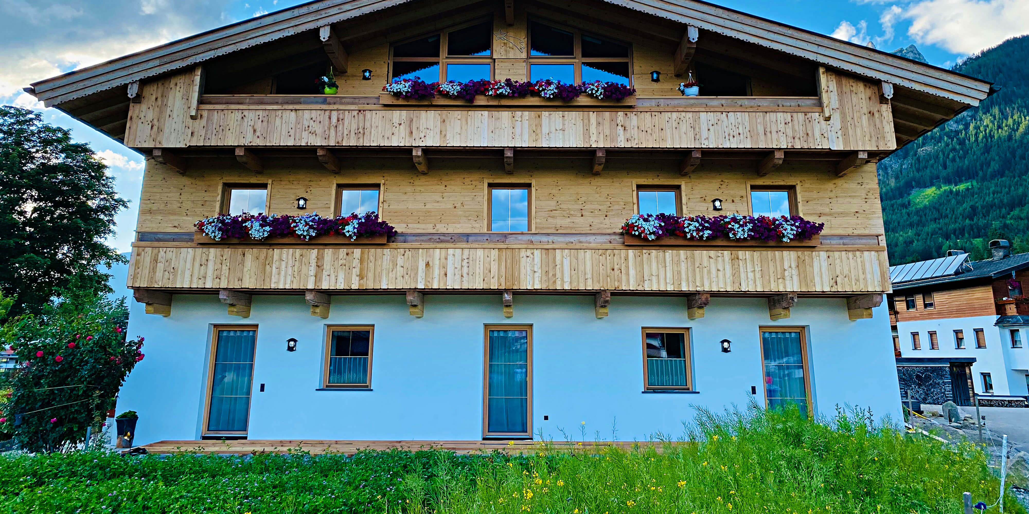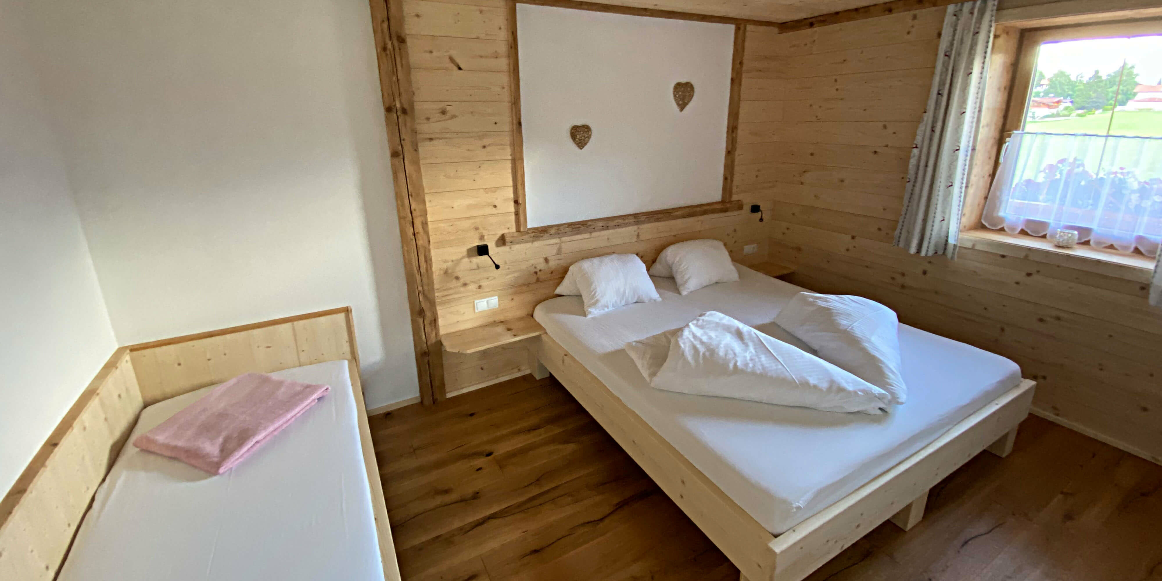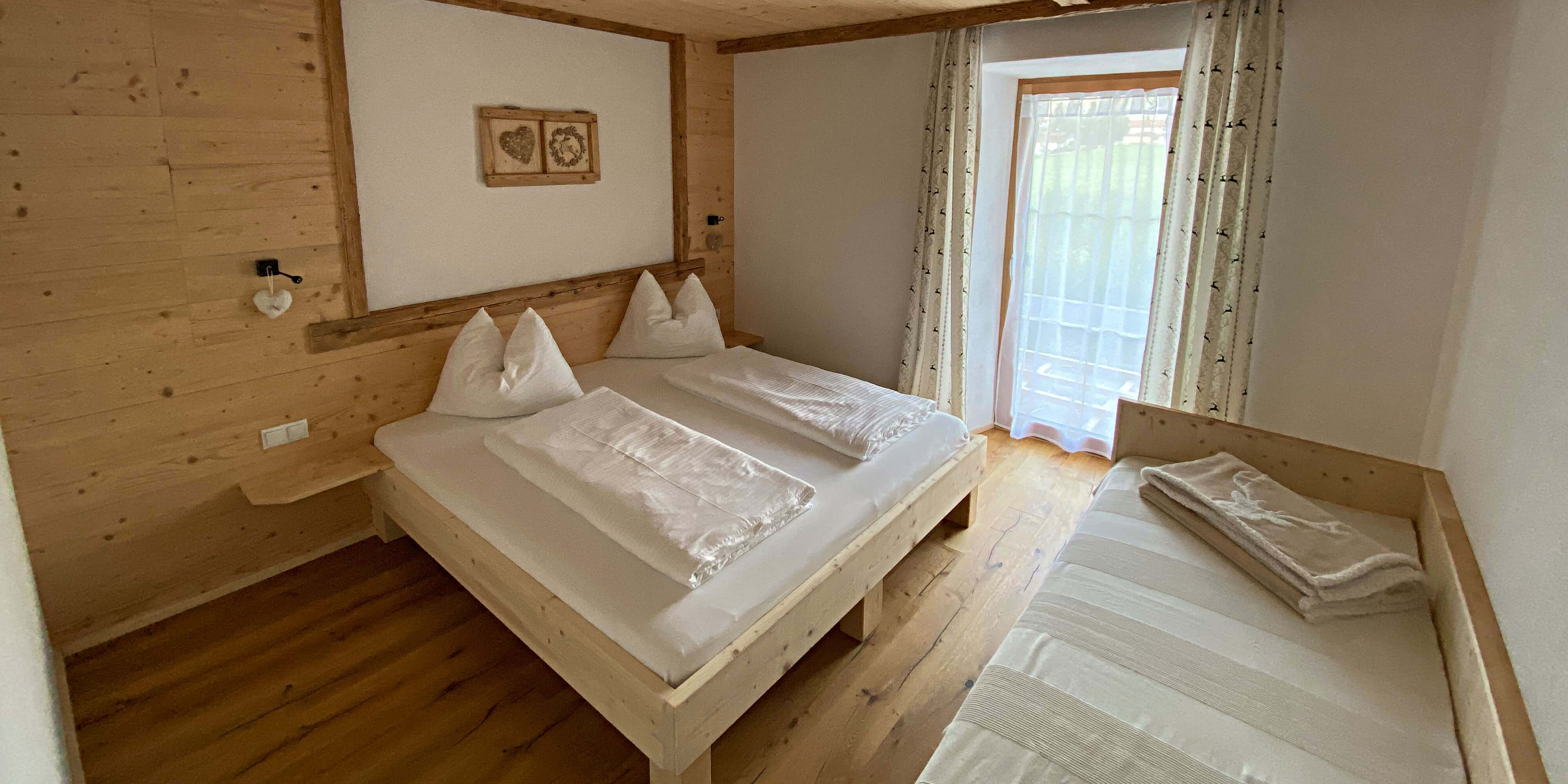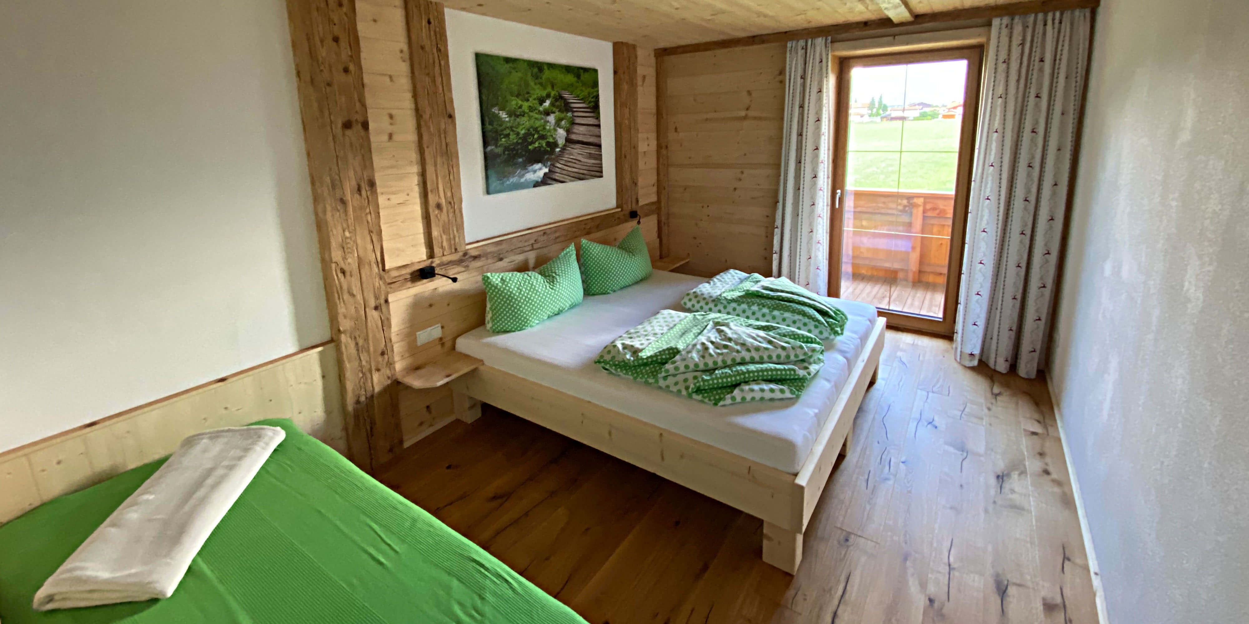 Böden aus Holz und Stein, Wände verputzt mit Kalk-Zement, mit Mineralfarbe geweißt innen und außen, mineralische Isolierung. Holz ist aus dem eigenen Wald und wurde selbst verarbeitet. Es wird bewusst auf chemischen Holzschutz verzichtet um unseren Gästen einen angenehmen wohltuenden Aufenthalt zu bieten. Wir bewirtschaften auch noch eine aktive biologische Landwirtschaft mit Tieren.