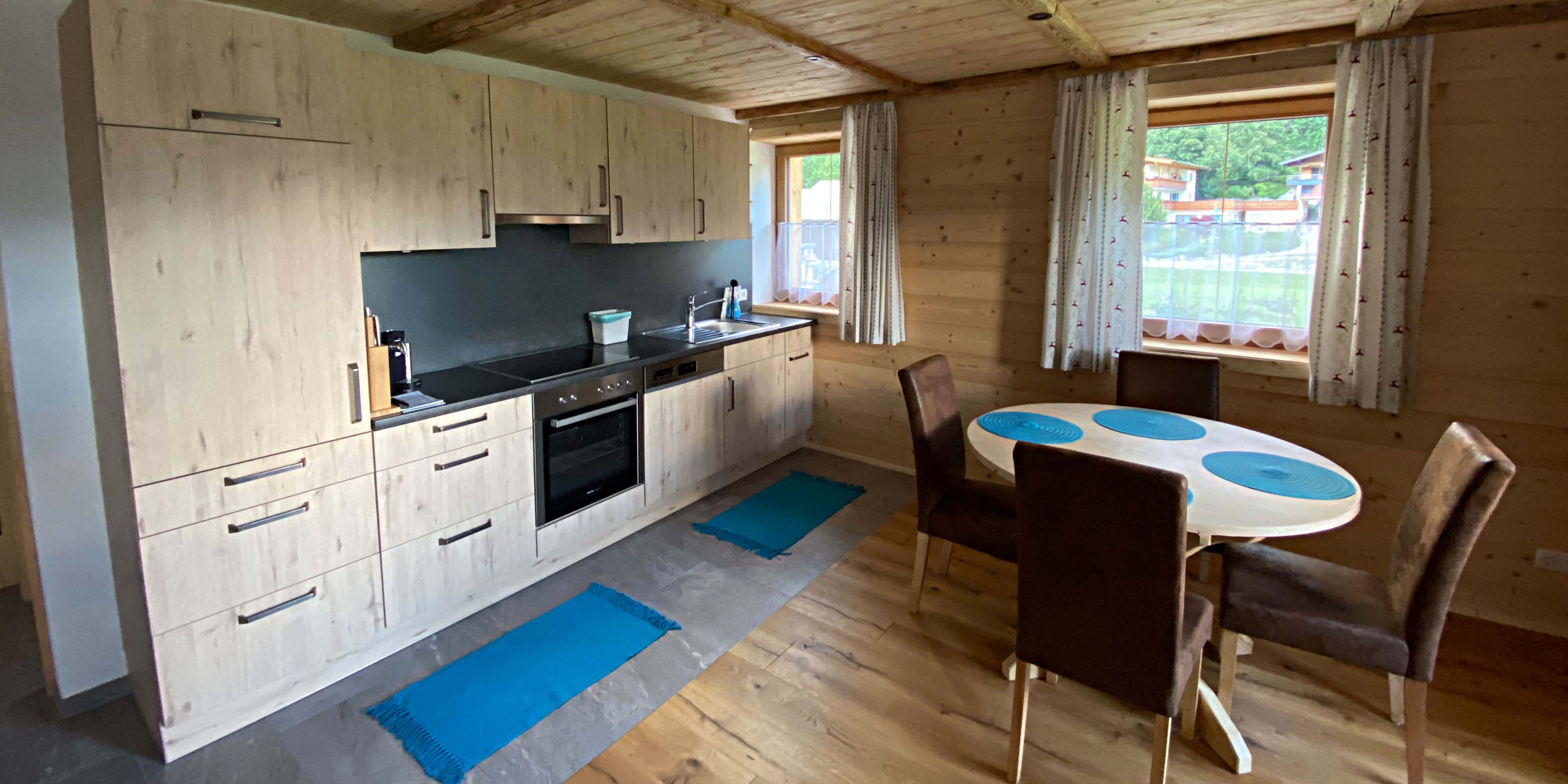 Böden aus Holz und Stein, Wände verputzt mit Kalk-Zement, mit Mineralfarbe geweißt innen und außen, mineralische Isolierung. Holz ist aus dem eigenen Wald und wurde selbst verarbeitet. Es wird bewusst auf chemischen Holzschutz verzichtet um unseren Gästen einen angenehmen wohltuenden Aufenthalt zu bieten. Wir bewirtschaften auch noch eine aktive biologische Landwirtschaft mit Tieren.